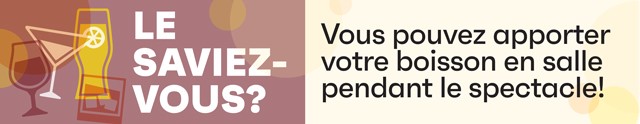 Nous offrons la vente de rafraichissements et de grignotines. N’hésitez pas à arriver dès l’ouverture des portes, une heure avant le spectacle, afin de profiter de nos espaces foyers chaleureux pour prendre un verre.