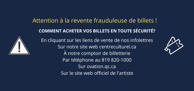 Le prix des billets inclut la redevance de la salle. Aucun frais supplémentaire pour les achats faits directement au guichet du Centre culturel.