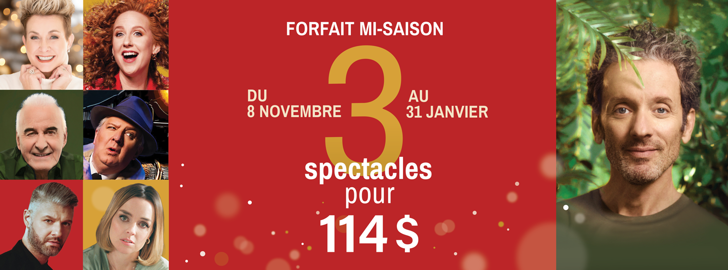 *promotion applicable sur 3 spectacles différents. Valide jusqu’au 31 janvier 2026. Ne peut être jumelée à aucune autre promotion, prix étudiant ou forfait. Valide uniquement sur les nouveaux achats effectués lors de la période promotionnelle. Prix sujets à changements.