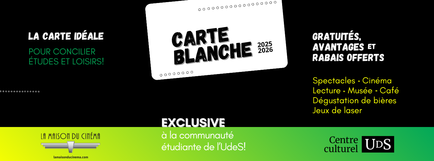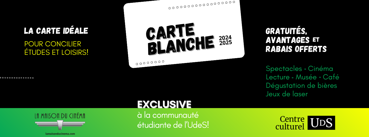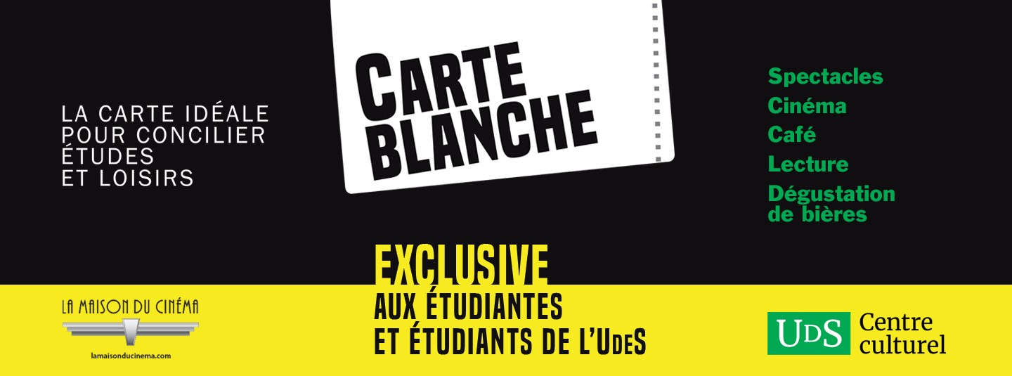 À noter: Les billets des spectacles éligibles à la carte blanche doivent être réservés directement au comptoir de la billetterie du Centre culturel (voir les spectacles éligibles en bas de page).
