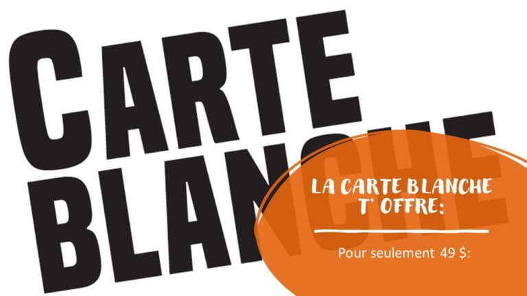 Conditions: Le statut de membre Carte blanche est échu le 30 juin de chaque année. Les privilèges qui n’ont pas été utilisés à cette date ne sont ni transférables ni remboursables. La personne étudiante ne peut se procurer qu’une seule Carte blanche pour son usage personnel et celle-ci n’est ni transférable, ni remboursable. La personne détentrice de la Carte blanche doit présenter sa carte étudiante de l’UdeS valide et sa Carte blanche lorsqu’elle assiste à chacun des événements ou si elle veut bénéficier des avantages supplémentaires; le prix indiqué inclut les taxes.